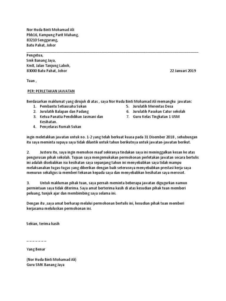 Anda ada hasrat untuk melepaskan jawatan di tempat kerja anda. Tandatangan itu mestilah diikuti dengan. BlokB Tingkat2 Lot 20 Taman HarmoniJalanBomba 90000 Sandakan Sabah.